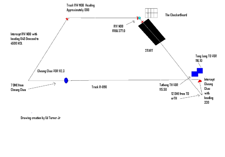 I recently did some research and found just what I was looking for regarding this rather unique pattern and approach. As most of you know in flight Sim 98. One of the adventures is the Checkerboard approach, where you are the Captain of a Bluesky 737 on a routine flight from Hong Kong. You as the blue Sky Captain are cleared to the Gheung Chau VOR. Via some other ATC info that eventually direct you to land on runway 13. Actually you start at this Hong Kong airport enter a pattern and return to where you started, hardly any wind though.